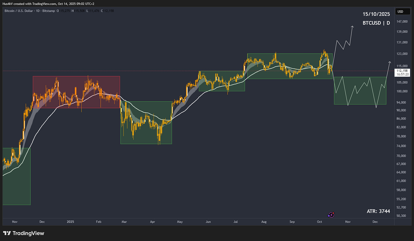 Technically, nothing much has changed, though. We’re just back in the range, and we’re waiting for directional cues. My expectation here is either for price to break out again and continue to a new ATH or to break down, form an accumulation, and continue higher again.
