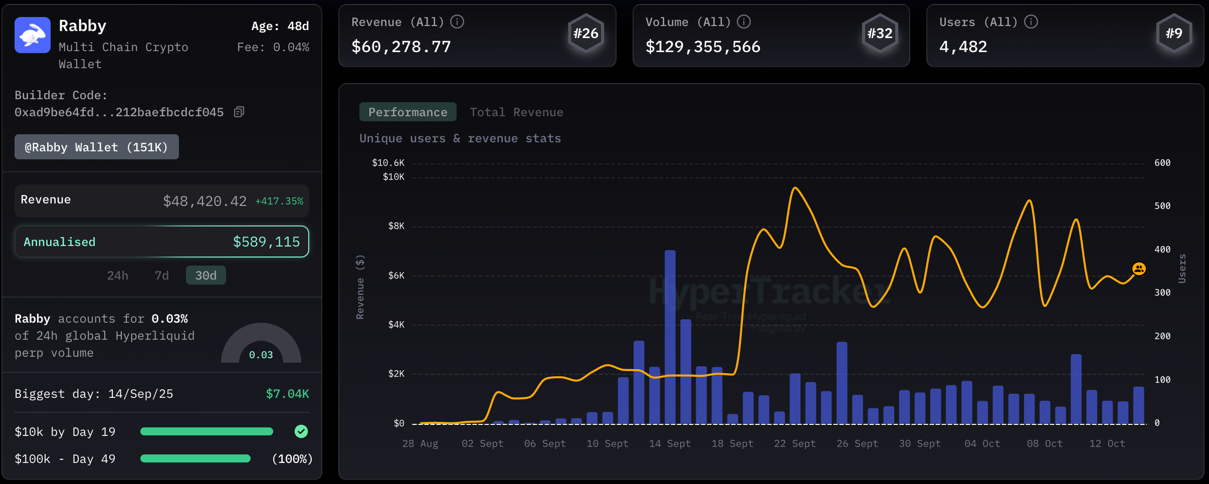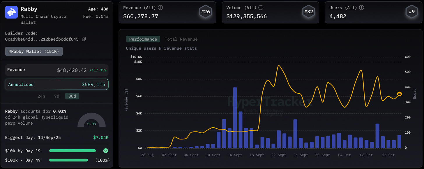 Leveraging the builder code api, Rabby ranked more than 60k USD in fees via over 4480 users doing more than 129 million in perp volume.