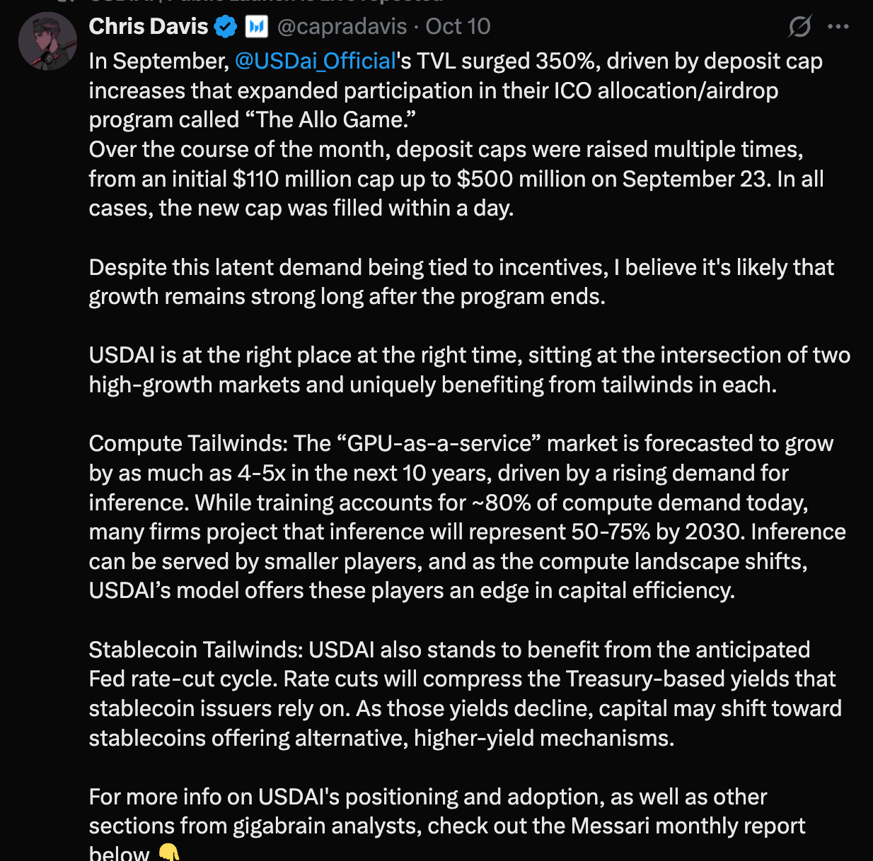 Chris from Messari wrote a great explanation on the importance of USDai and the future projected growth of its market: