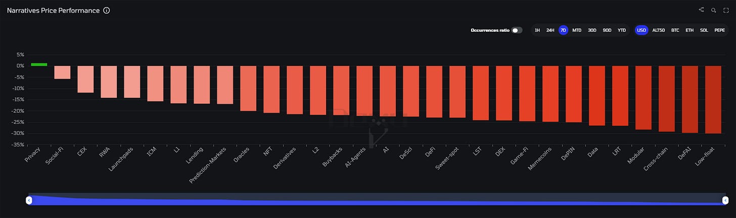 Given what happened, it should come as no surprise that we see a huge red wave across the entire market. Pretty much every sector is in red. Privacy has shown the most resilience, mostly thanks to RAIL and ZEC. The rest lost up to -30%. Even though that’s not a nice scene to look at, the fact that Privacy is showing this much strength is a thing to note and keep in mind going forward.