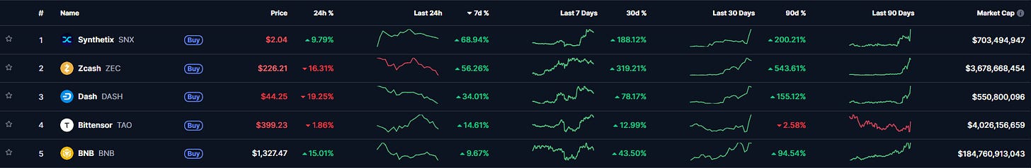 This 7d % TOP 5 is quite an OG one. Even during these uncertain times, some coins just don’t give a single F. SNX pumped an impressive +68%, ZEC continues to earn its spot at the top with a +56% gain, and DASH gained +34%. After that, the gains fall off significantly, and anything below the TOP 10 is negative.