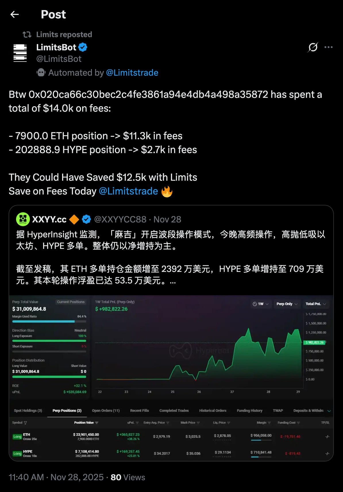 So this is why i’m covering it this week. I think ppl trading size on Hypercore should have a look at what they have been doing. And I think that HL builders should too. Its truly making the trading execution on HL much efficient price wise.