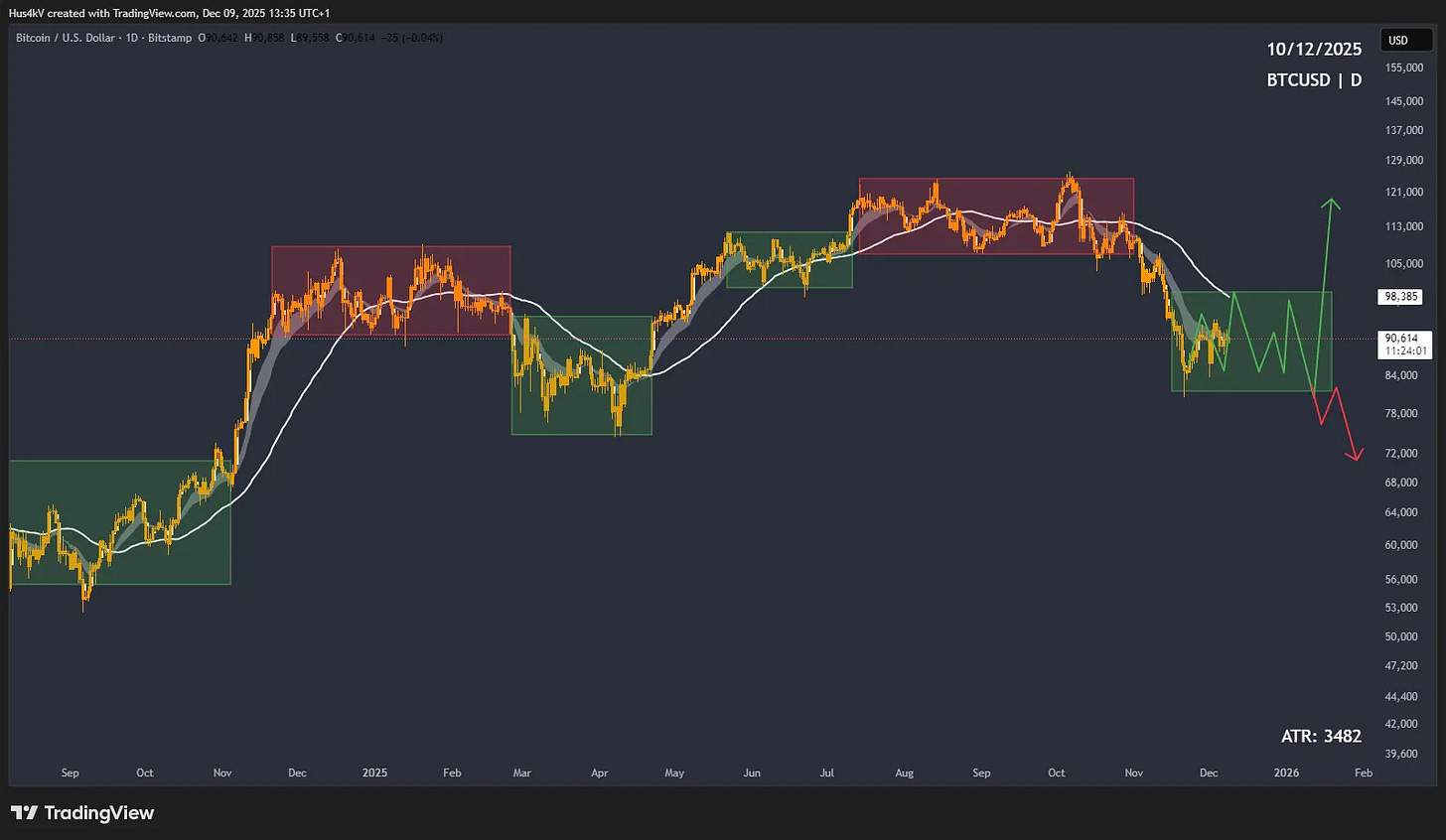 Looking at the daily BTC chart, we can finally see price going a bit sideways - finding supply/demand equilibrium. This is an important stage in price development because if we expect bullish continuation, we want to see price print an accumulation schematic here.