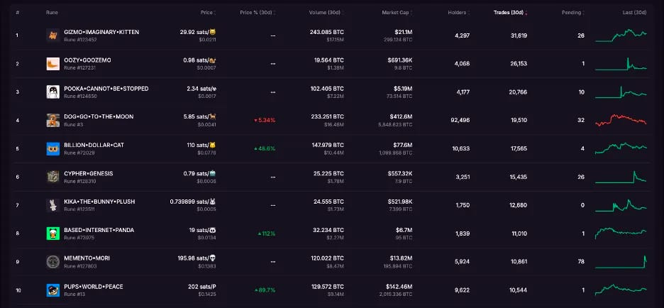 While $DOG remains among the top 10 Runes over the past 30 days, following its airdrop to Runestone holders, current attention has shifted to $PUPS (which also has its own derivative on Solana), as well as $GIZMO and $BDC, both of which are cat-themed tokens, which could be catalyzed by the release of OP_CAT in the near future.