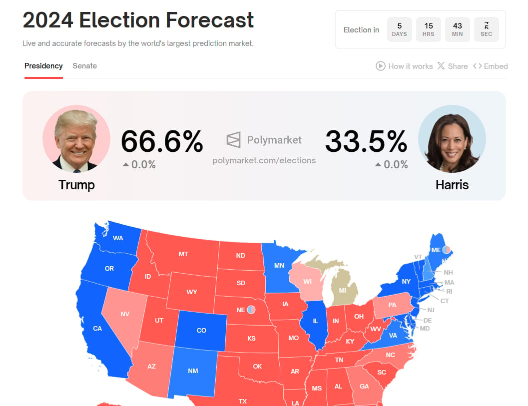 The probability of Trump winning the US presidential election on the prediction market Polymarket rose to 67.1%, while the likelihood of Harris winning fell back to 33.1%, a difference of 34 percentage points.