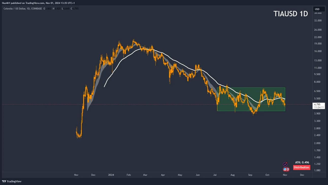 So let’s have a peek at another chart today - TIA. So this scenario is as about obvious as it gets. TIA has been in a downtrend ever since reaching its ATH (all-time-high) at around 20$ and now finds itself going sideways for a prolonged period of time.