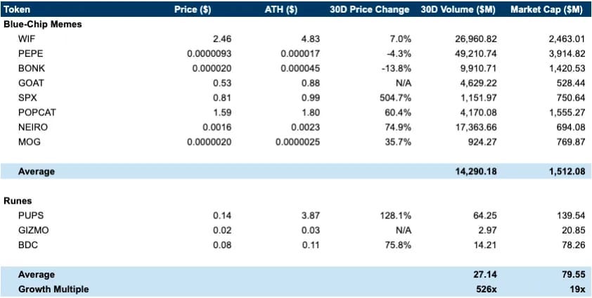 This stark disparity indicates a significant growth opportunity for BTC memecoins as adoption increases. With imminent listings among top CEXs, early investments could yield substantial returns before prices soar as retail interest surges, spurred on by the introduction of platforms like Moonshot. Valuations of $PUPS, $GIZMO and $BDC are still a far cry as compared to this cycle’s blue-chip memes which suggests attractive entries for a higher risk-reward ratio.