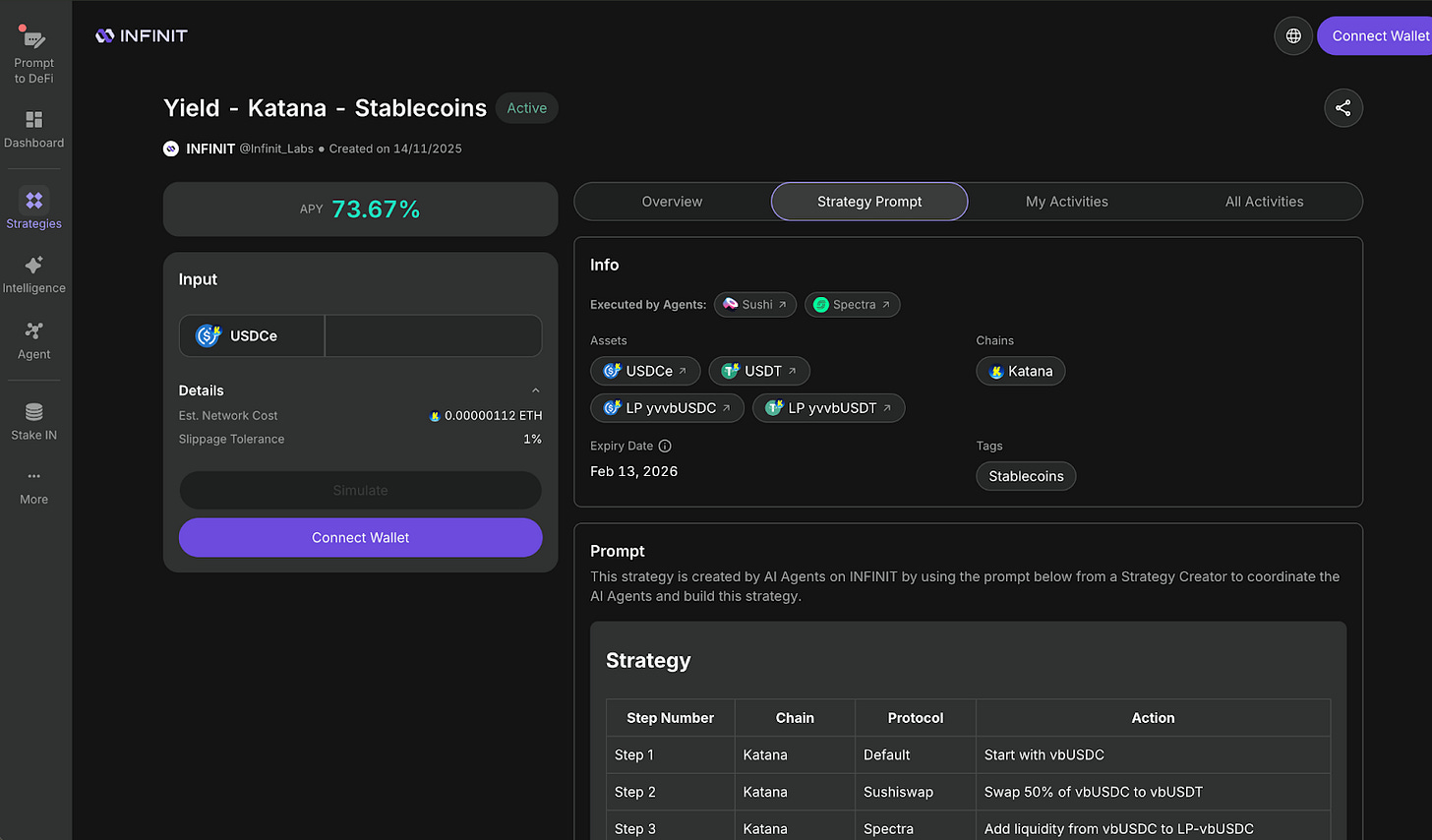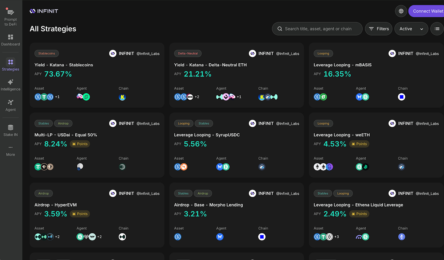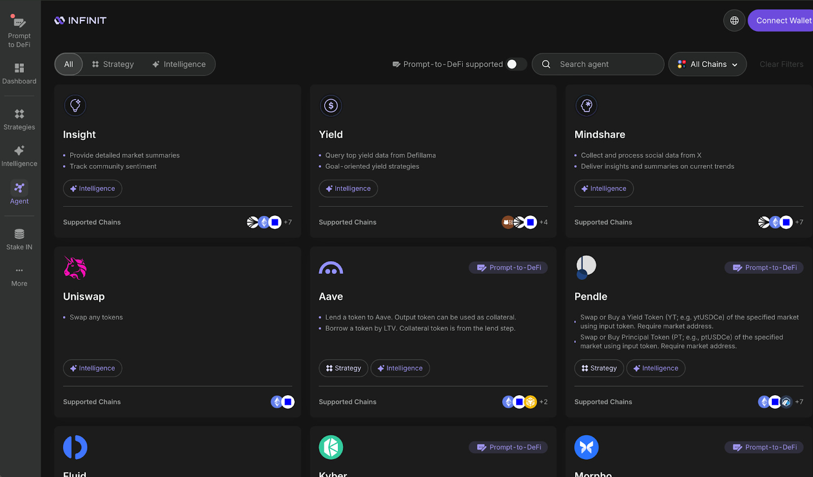 On INFINIT, this is possible through their “Prompt-to-DeFi”, where their agents execute strategies across DeFi protocols.