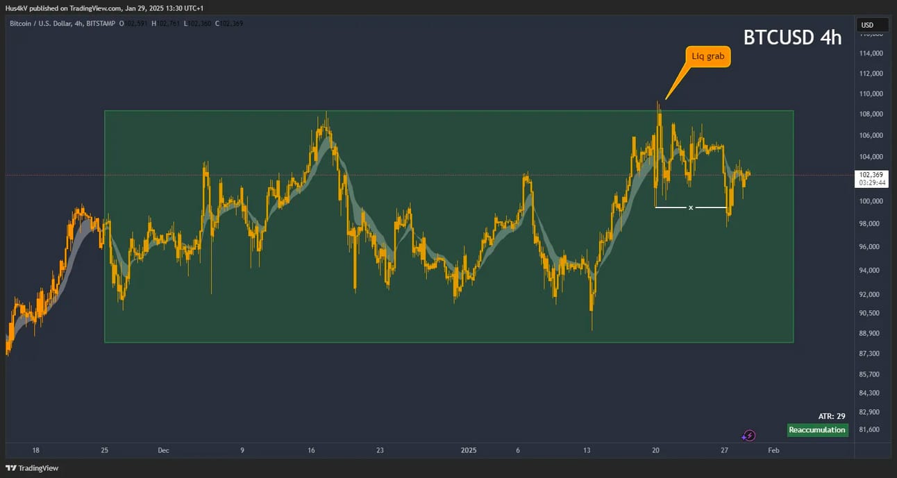 That being said, I’m seeing first signs of loss of momentum on the lower timeframes. When we zoom into the current sideways price action we can clearly see that the range high was liquidated without immediate continuation.