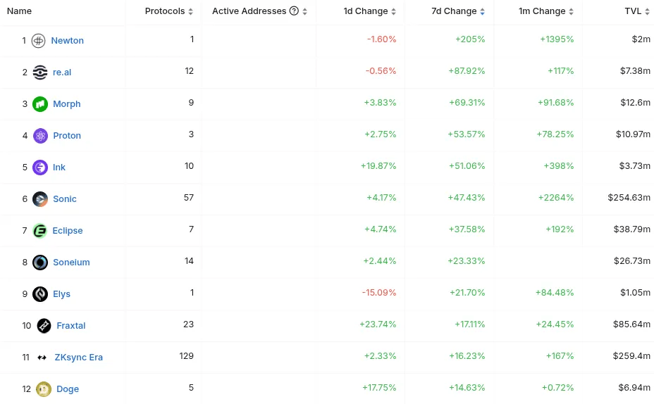 Looking at chains with established liquidity above $1M, here are the fastest-growing networks by TVL over the past month, according to DefiLlama data.