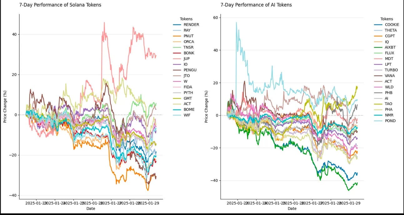 DeepSeek's breakthrough dominated headlines this week, triggering a significant Nvidia selloff and sparking intense debates around AI-crypto valuations. The market's telling a mixed story: while BTC and ETH show resilience (+2.88%, +2.16%), AI-related tokens are taking a hit, with the sector down 12.08%.