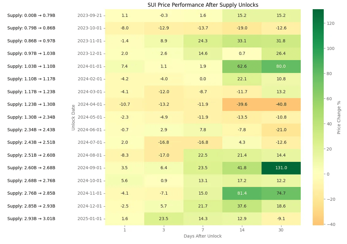 Looking at the price performance of $SUI after unlocks, 2024 was the best-performing year for SUI, even after those 1B-3B token unlocks.