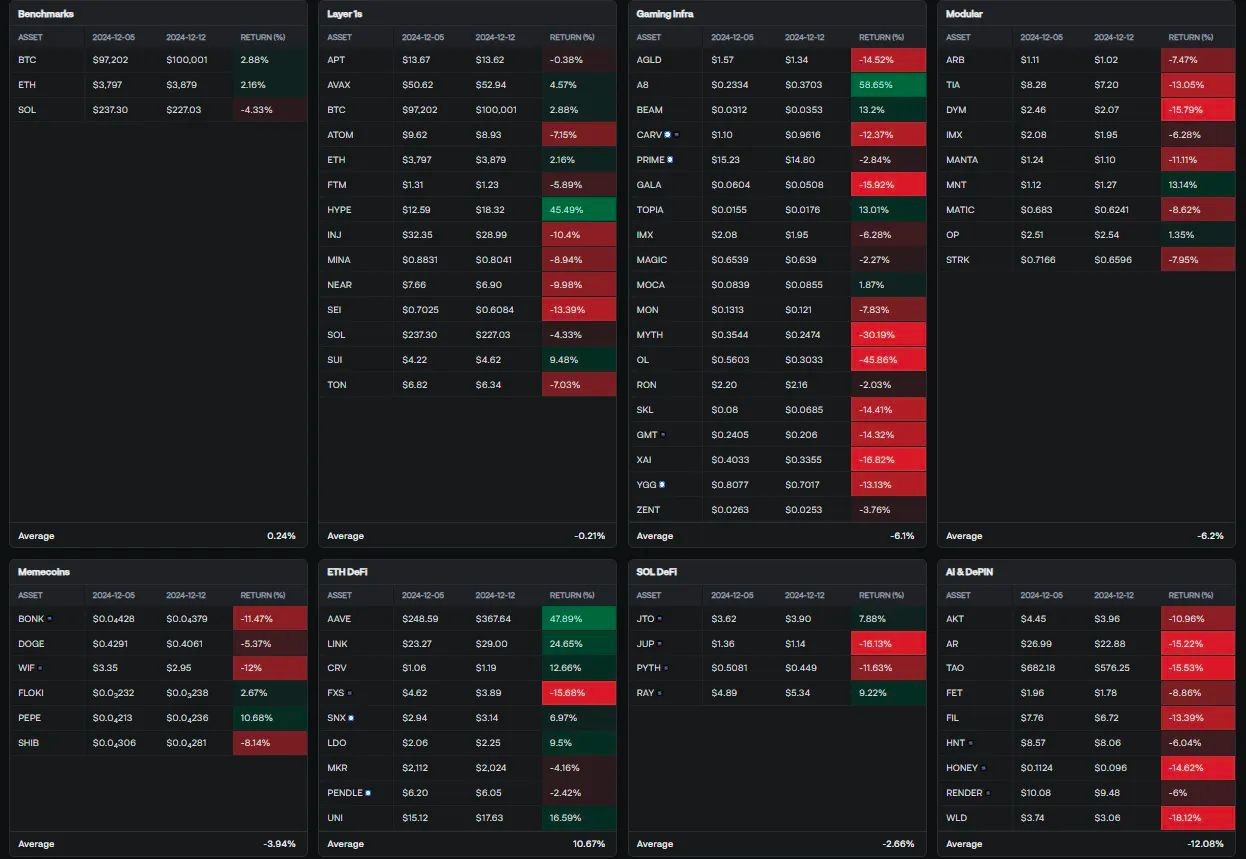 DeFi's staging a comeback though: AAVE and LINK surged (+47.89%, +24.65%), while HYPE leads Layer 1 gains at +45.49%. Gaming tokens are mostly in the red, but AR's massive 56.65% jump stands out against AGLD's 14.52% decline.