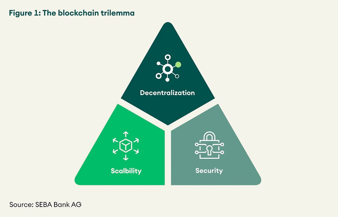 However, the scaling approaches these Alt-L1s are taking often come at the cost of decentralization and security. Alt-L1 chains like Solana for example have chosen to go with a smaller validator set and have increased hardware requirements for validators. While this improves the network’s ability to verify the chain and hold its state, it reduces how many people can verify the chain themselves and increases barriers to entry in network participation. This conflict is also referred to as the blockchain trilemma (visualized below). The concept is based on the idea that a blockchain cannot reach all three core qualities that any blockchain network should strive to have (scalability, security & decentralization) all at once.