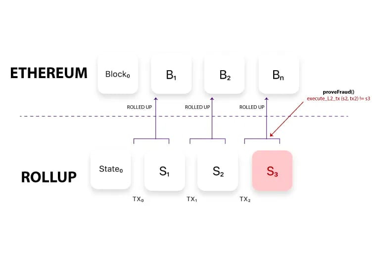 What are referred to as optimistic rollups are characterized by having a sequencer node that collects transaction data on L2, subsequently submitting this data to the Ethereum base layer alongside the new L2 state root. In order to ensure that the new state root submitted to Ethereum L1 is correct, verifier nodes will compare their new state root to the one submitted by the sequencer. If there is a difference, they will begin what’s called a fraud proof process. If the fraud proof’s state root is different from the one submitted by the sequencer, the sequencer’s initial deposit (a.k.a. bond) will be slashed. The state roots from that transaction onward will be erased and the sequencer will have to recompute the lost state roots.