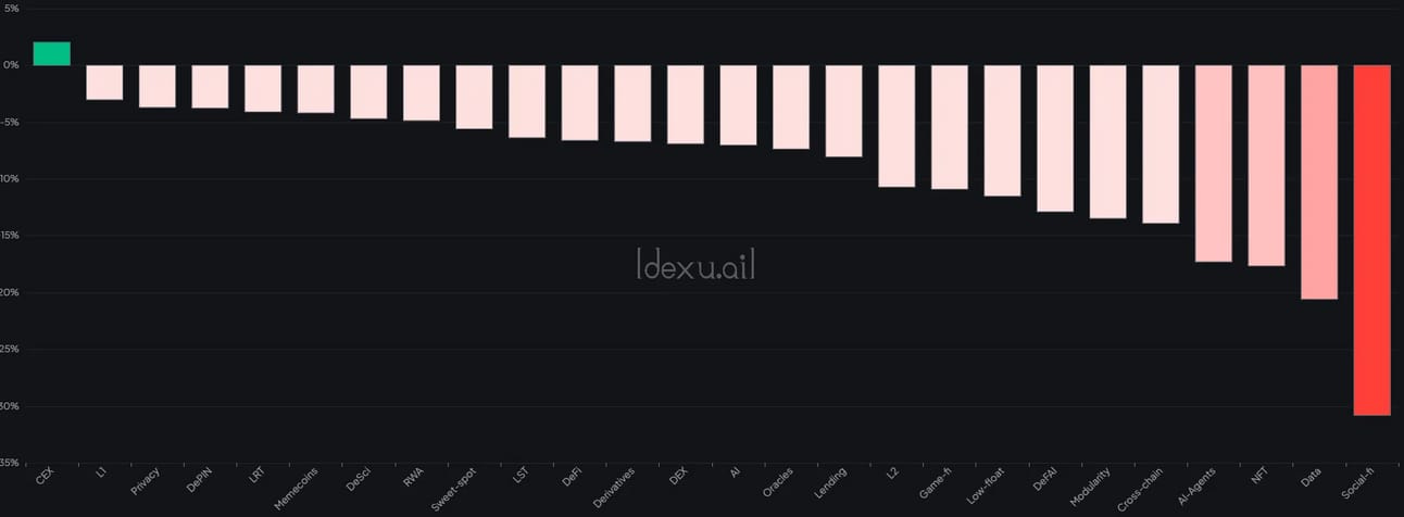 CEX coins are the only only ones seeing positive numbers with $CRO and $BGB leading the charge.