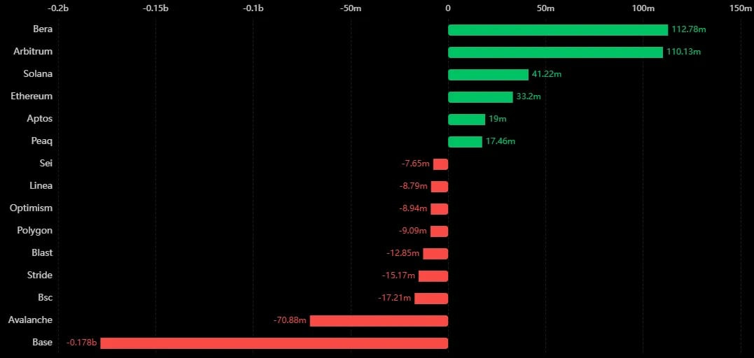 With BERA POL about to kick off, it is no surprise to see significant inflows into the ecosystem. Arbitrum is also seeing a significant inflow—is that because it’s the main bridge to Hyperliquid, or are they cooking something?