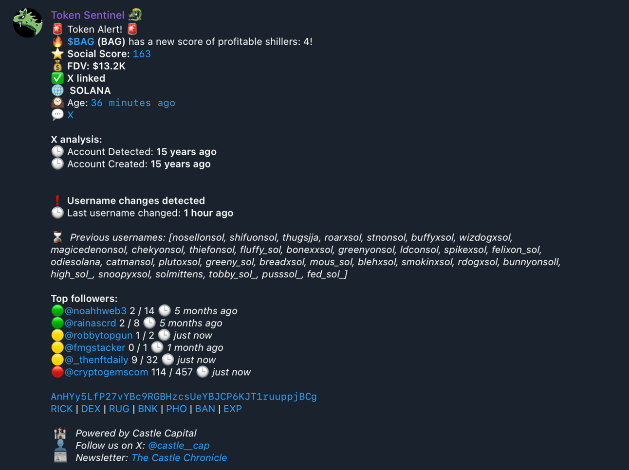 Username Changes: Displays previous usernames from the X account used, allowing users to double-check whether this account was previously used for rugs (see below)