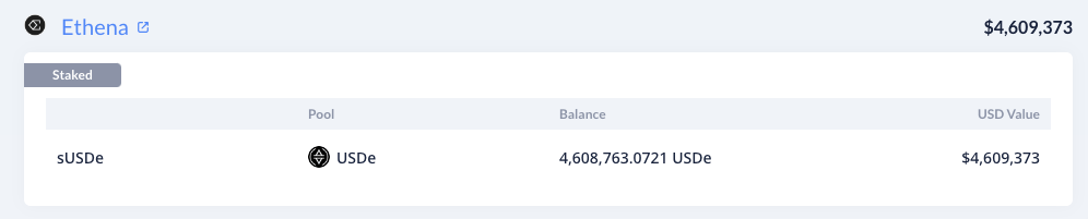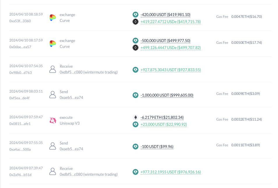 The following address started to receive a lot of USDT from Wintermute only a day after Hayes sent the $GMX to the market maker. Most of the stablecoins were exchanged for USDe on Curve and staked on Ethena.