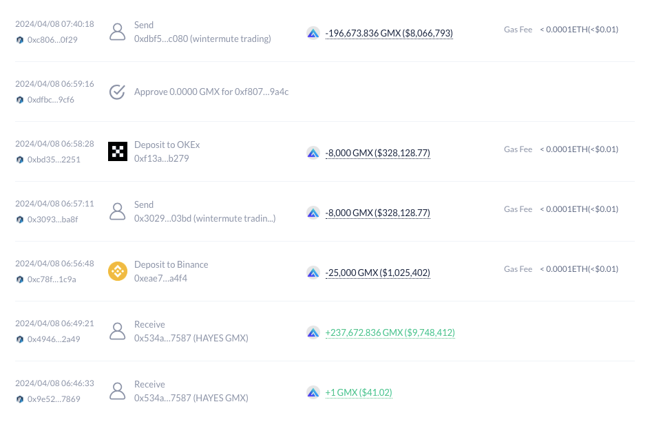 On the 8th of April, Hayes unstaked his $GMX and sent it to the following address, which subsequently sent the tokens to CEX and Wintermute.