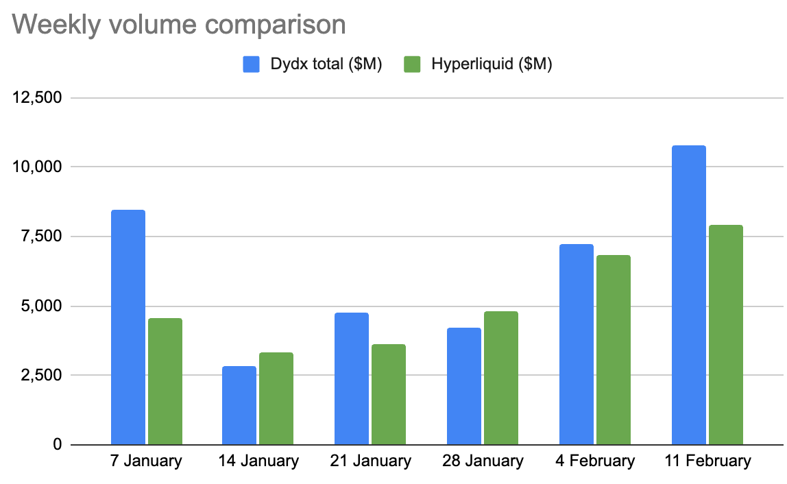 How do Hyperliquid volumes compare with DyDx numbers?