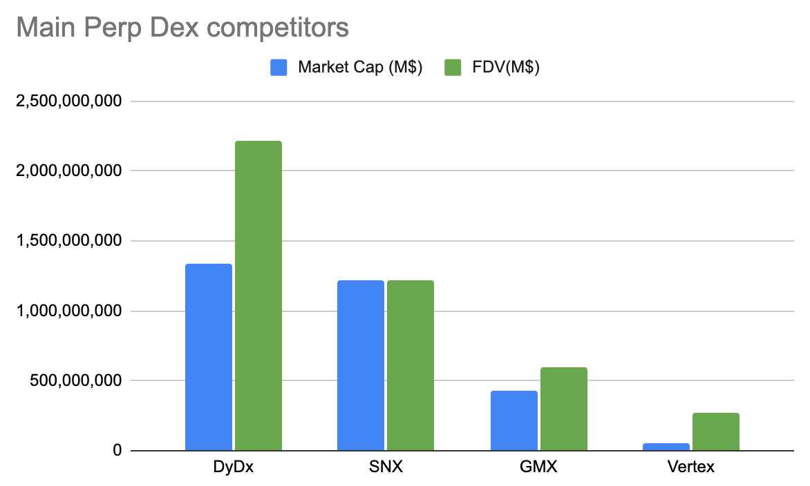 DyDx was the first perpetual DEX to be deployed and has retained the number as one of the spot by trading volumes (even though GMX is the number one by fees) and commands the higher valuation across the segment both in terms of market cap and FDV, sitting at $1.3B and $2.2B.