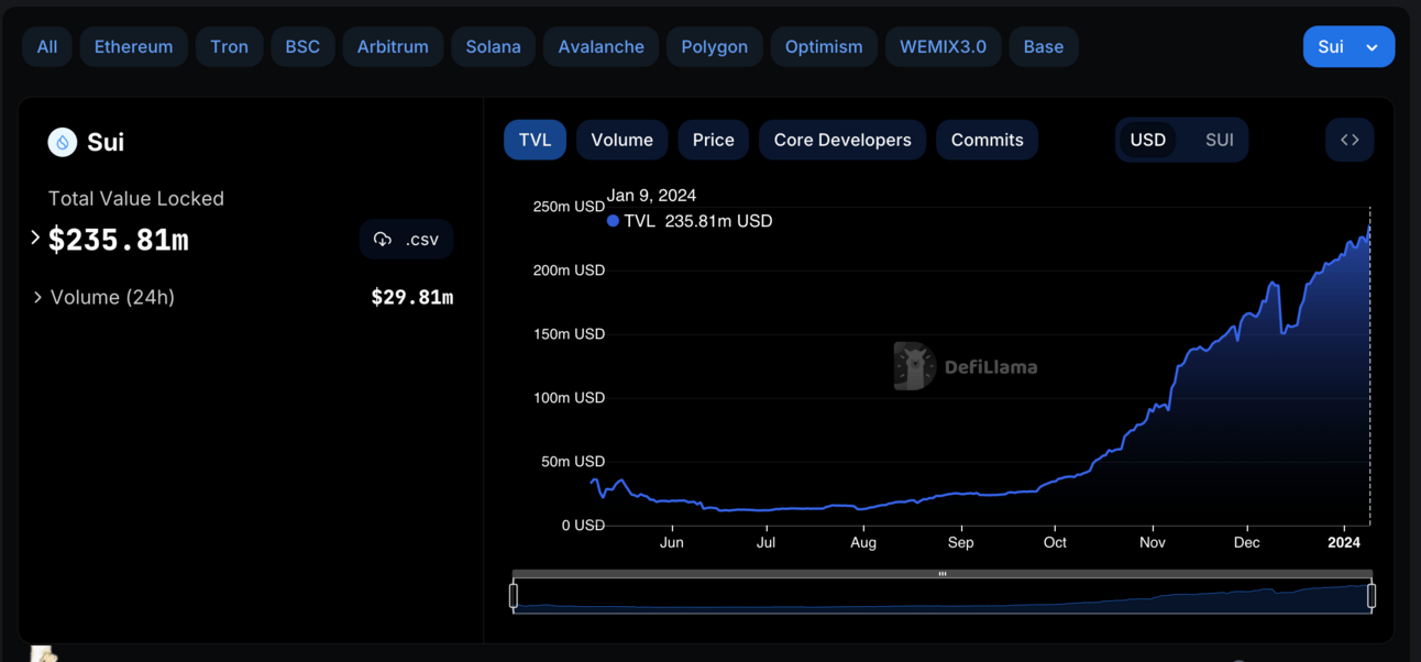 SUI has been trending nicely over the past few weeks. The token price has surged over 100% since the end of October and the TVL has increased past $200 mln. Take into account that a lot of this surge is due to the price increase of SUI.