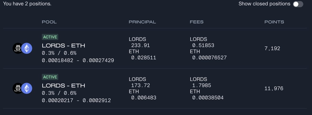 I picked two highly volatile tokens: LORDS/WETH (game token) and AKU/WETH (meme token) and set the price ranges relatively tight. I tend to check in every day in the morning and evening to see if the prices are still within my ranges.