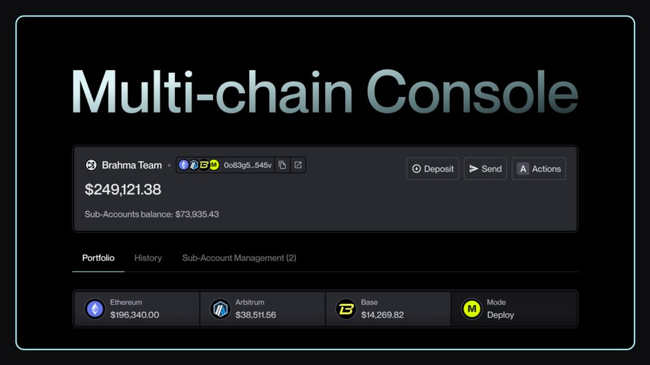 Brahma Console is an integrated account that enables seamless dApp connectivity with a smooth mult-chain execution experience. Console offers an intuitive UX, manages capital efficiently, & connects user intents, for faster, cheaper, and more secure transactions.