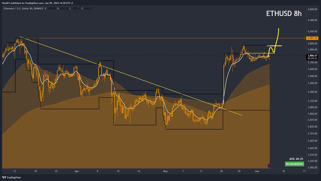Last week I wanted to see some sideways chop on around the 8h timeframe for the MA’s to catch up to price. We see exactly that happening right now. This is the re-accumulation of the current push and all I’m waiting for now is a clear sign of strength that will take us out of the consolidation.