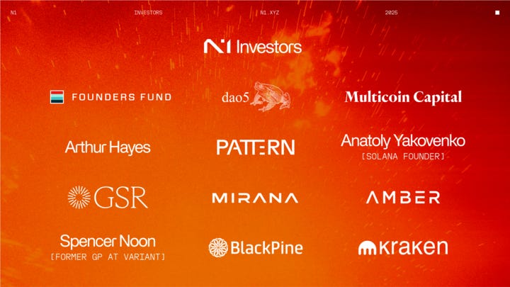 Like MegaETH, N1 onboarded flagship protocols aimed at transforming crypto entirely. So far, the most widely adopted crypto applications are perps, lending, stablecoins, memecoins, launchpads, and other retail-friendly venues with a sleek UI. N1 has few apps, but, like Palantir, Nubank, or SpaceX in their respective fields, it aims to entirely remodel the crypto experience. This aggressive approach mimics Thiel’s TradFi products, with one company for one sector, one monopoly for one target audience. Drones for the White House, rockets for Musk, lightning-speed apps for traders.