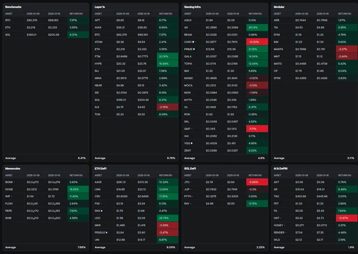 Fartcoin and GRIFFAIN also climbed over 27%, while the Hyperliquid ecosystem saw HFUN up 34.93% and PURR up 15.46%. XRP, XDC Network, and Lido DAO also posted notable gains, with Meme coins, Layer 1 and Layer 2 tokens showing steady growth.