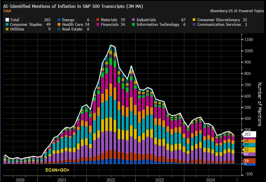 Mentions of inflation during S&P 500 earnings calls have significantly decreased compared to the 2022 peak and much of 2023, indicating that inflation is no longer a major focus for many sectors.