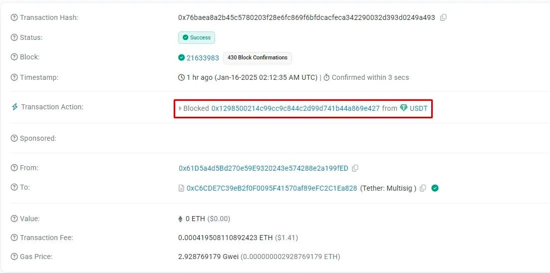 Tether recently blocked an address holding $50M USDT.