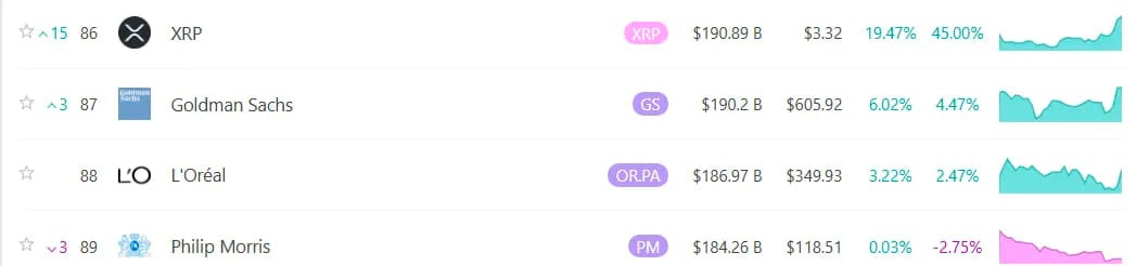 XRP's market value surpasses Goldman Sachs.