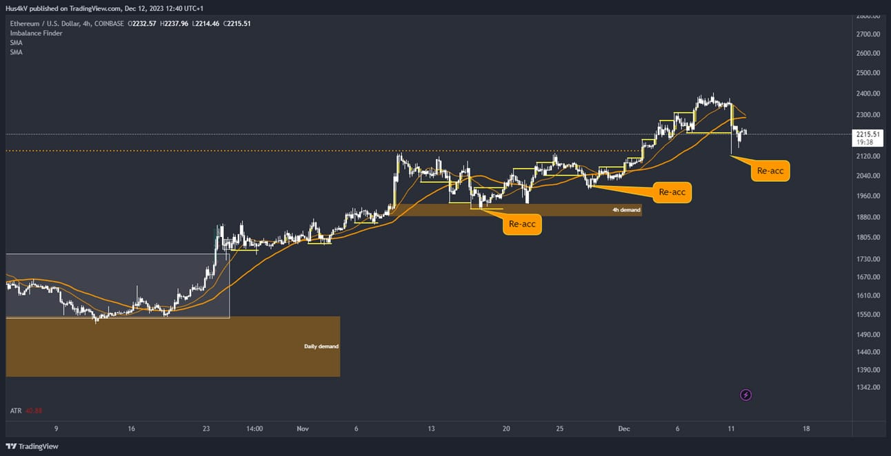 Last week price continued liquidating highs as expected and has presented quite a few nice bullish setups. I pointed out that the current push might be a bit overextended and we could see a new re-accumulation soon. That’s exactly what’s happening right now.