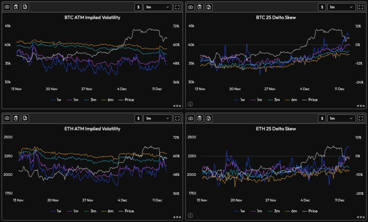BTC and ETH IVs haven’t seen much change despite large fluctuations in price (ie no squeezes). Skews have been shown to have been an accurate indicator before the large fall. Both BTC and ETH skews were shown to be much higher(put favored) towards the drop. Currently, both BTC and ETH skews are still pointing in a bearish direction for the next week.